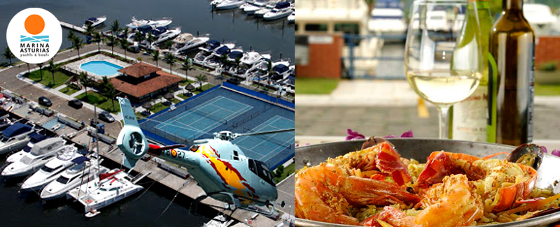 O pouso no heliponto da Marina Astúrias inclui almoço no restaurante, com livre escolha de pratos, bebidas e sobremesas. Champanhe e taças personalizadas também farão parte desse passeio.